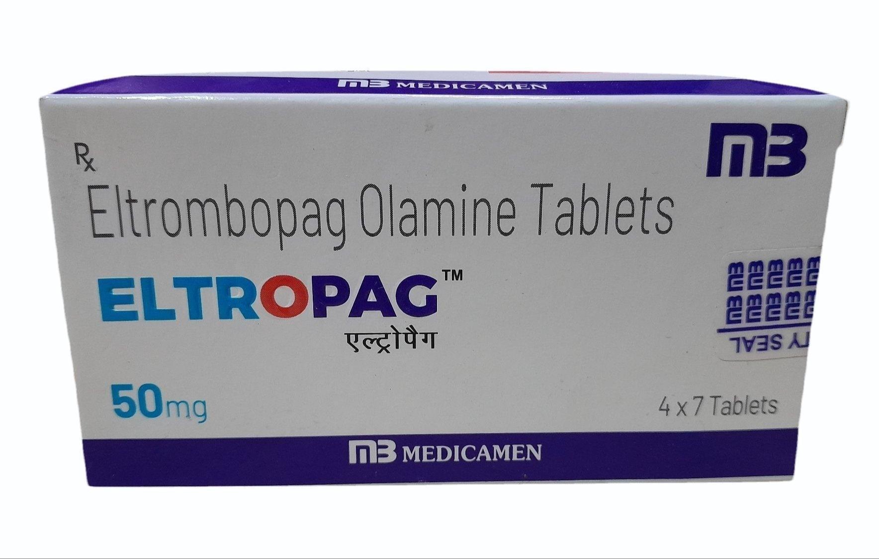 Eltrombopag olamine, a thrombopoietin receptor agonist (TPO-RA), is an ingredient in the prescription oral medication Eltropag 50mg. In patients with severe aplastic anemia, hepatitis C-associated thrombocytopenia, and chronic ITP, it is recommended to raise platelet counts. This medication helps the bone marrow produce more platelets by imitating the body’s natural signals.