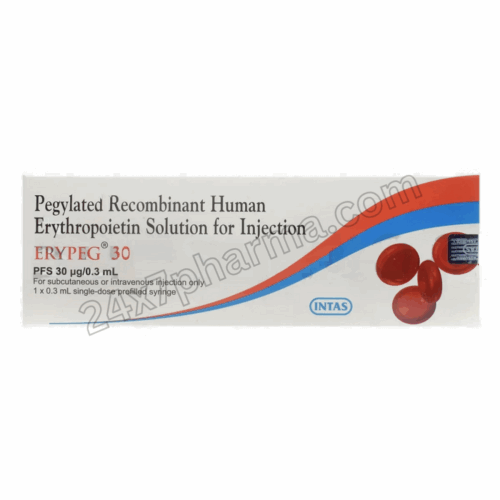 The active ingredient in ERYPEG 30MCG Injection is Pegylated Erythropoietin, a long-acting form of erythropoietin. Normally, erythropoietin is produced by the kidneys in response to low oxygen levels in the body. It signals the bone marrow to produce more red blood cells, which helps increase oxygen transportation to tissues. In patients with conditions like chronic kidney disease or those undergoing chemotherapy, natural erythropoietin levels may be insufficient, leading to anemia.