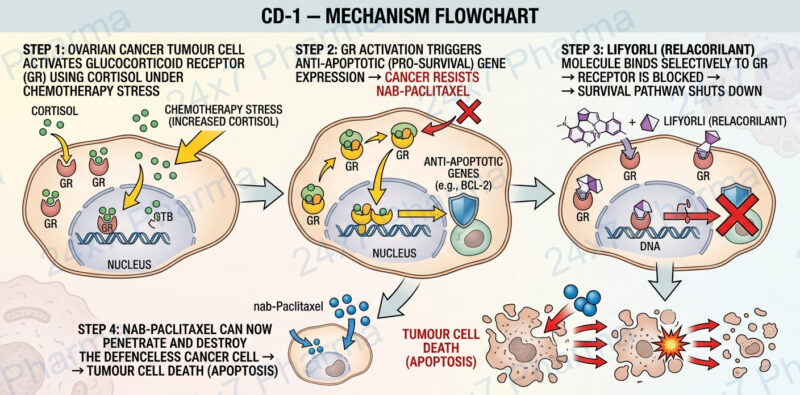 Unlike traditional chemotherapy drugs that directly target tumour DNA, Lifyorli works at the hormonal level — blocking the cortisol receptor that cancer cells weaponise to escape destruction. It is available as an oral tablet, making it a convenient addition to an existing chemotherapy regimen.