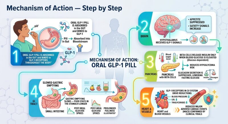 1. Step 1: Oral GLP-1 pill is absorbed in the gut and binds to GLP-1 receptors throughout the body.
