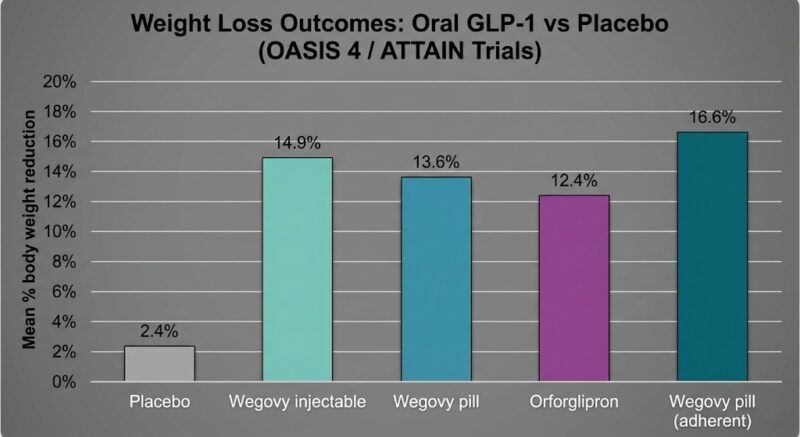• Significant weight loss: 13.6%–16.6% mean body weight reduction in the OASIS 4 Phase 3 trial (Wegovy pill) and up to 12.4% in ATTAIN-1 (orforglipron) — comparable to weekly injectables.